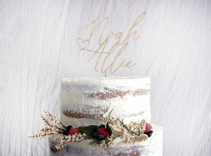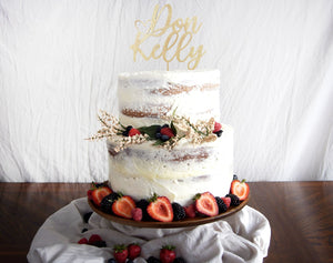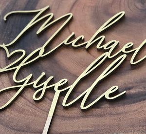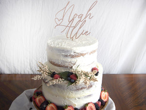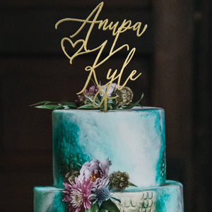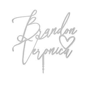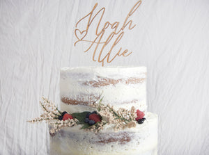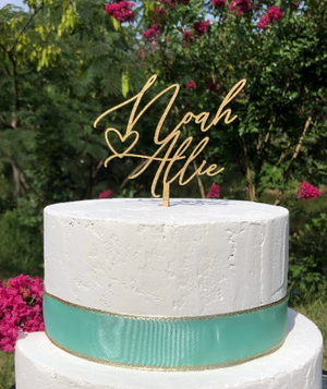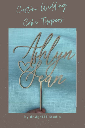 Personalized Couples Name Cake Topper 6" In. Width to suite most standard Wedding Cakes. This cake topper is suitable for many occasions to include Weddings, Bridal Showers, Engagement Parties, Anniversaries, and more! Our products are made from high quality sourced wood & they make the perfect keepsake/memento that will last for years to come.
