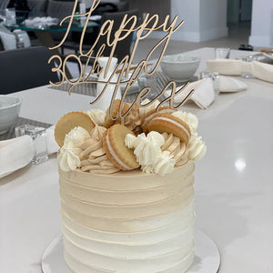 Our Acrylic Cake Toppers are food safe, simply insert into the top tier of your cake for a unique & sweet addition. Please do note that the metallic spray paint used on our wood, is not food-safe. We suggest wrapping the part of the stake that's going inside the cake with cling/saran wrap film if you intend to eat the part of the cake where the stake is in :) We won't spray the Stake that's going into the cake to ensure proper food-safety precautions as well.