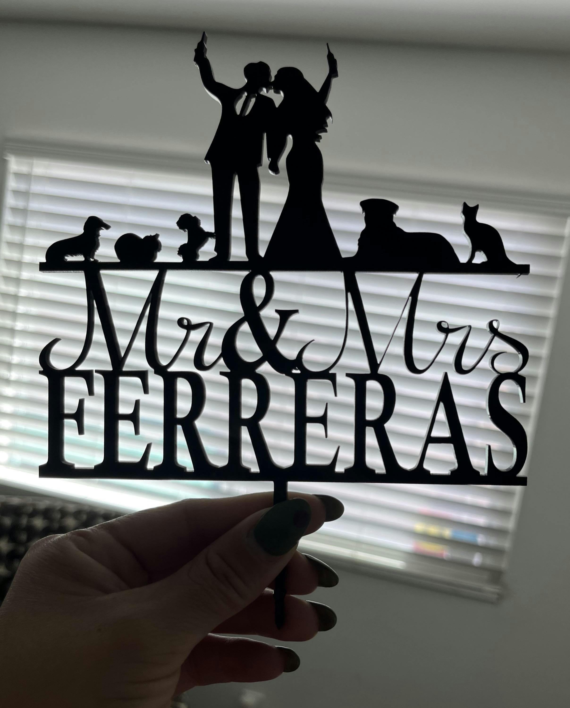Custom Silhouette Couple Cake Topper with dog/cat in several Width options to suite multiple Cake Sizes. Personalized exactly to your liking with your own pets! Our products are made from high quality, cast acrylic, & quality sourced Wood & they make the perfect keepsake/memento that will last for years to come.